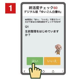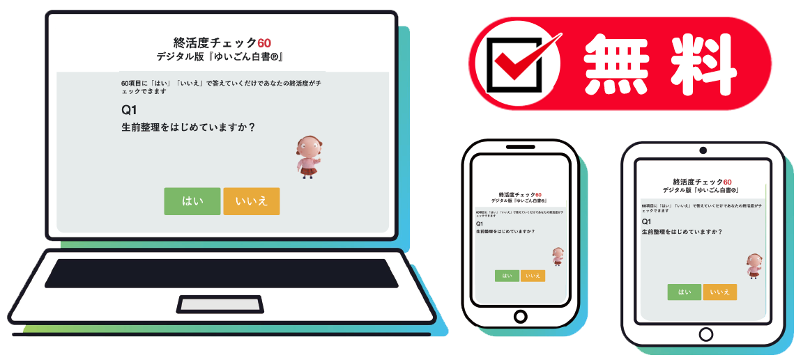 「終活度チェック60」~デジタル版『ゆいごん白書®︎』なら、60項目の質問に「はい」「いいえ」で答えていくだけで、終活に必要な項目が「見える化」できます。