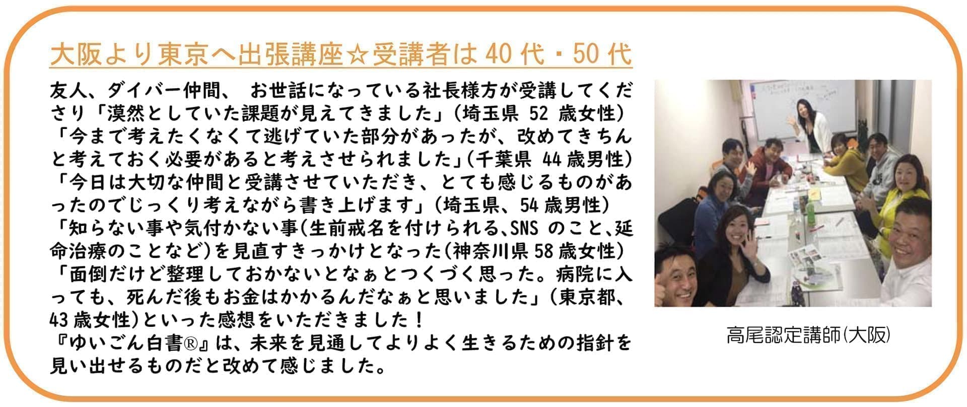 ※『ゆいごん白書®』は「知識の教授,資格の認定・付与,セミナーの企画・運営又は開催」等についても商標登録をとっており、『ゆいごん白書®』を使っての講座開催は商標権侵害にあたります。資格の認定を受けていない人は講座の開催はできませんので、ご興味のある方は下記よりお問い合わせください