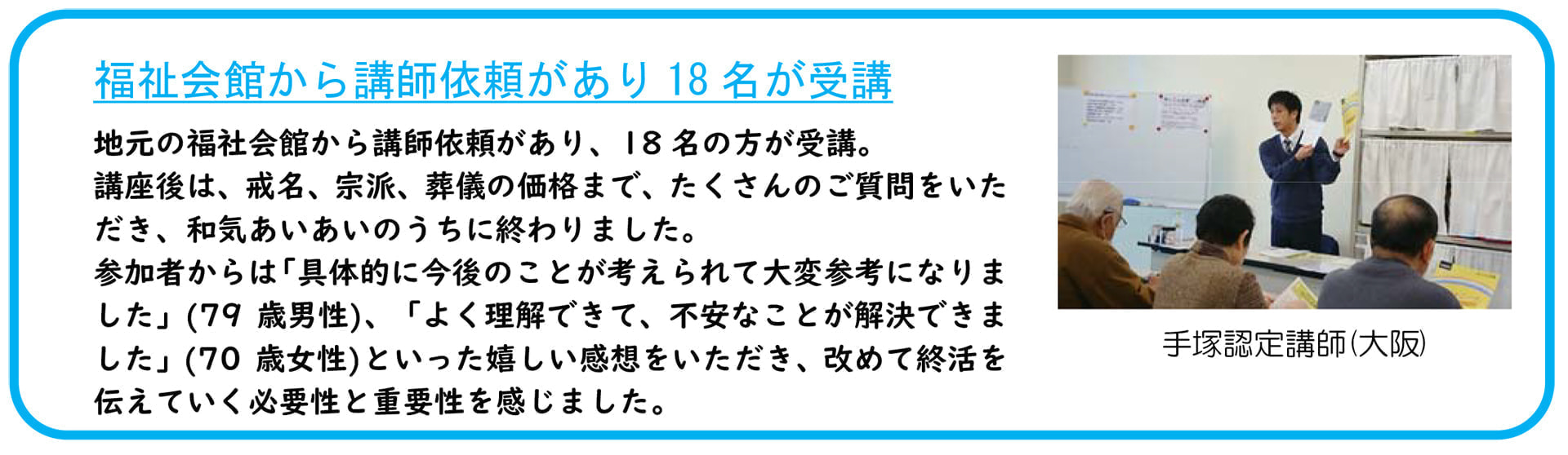 これまで、商工会議所、教育委員会、ロータリークラブ、福祉会館、市民大学、日本電信電話ユーザ協会、保険会社、高齢者施設、社寺、佛教会、UR都市機構、霊園、葬儀社、NHK文化センター、JEUGIAカルチャースクール等からも講座依頼をいただいております。