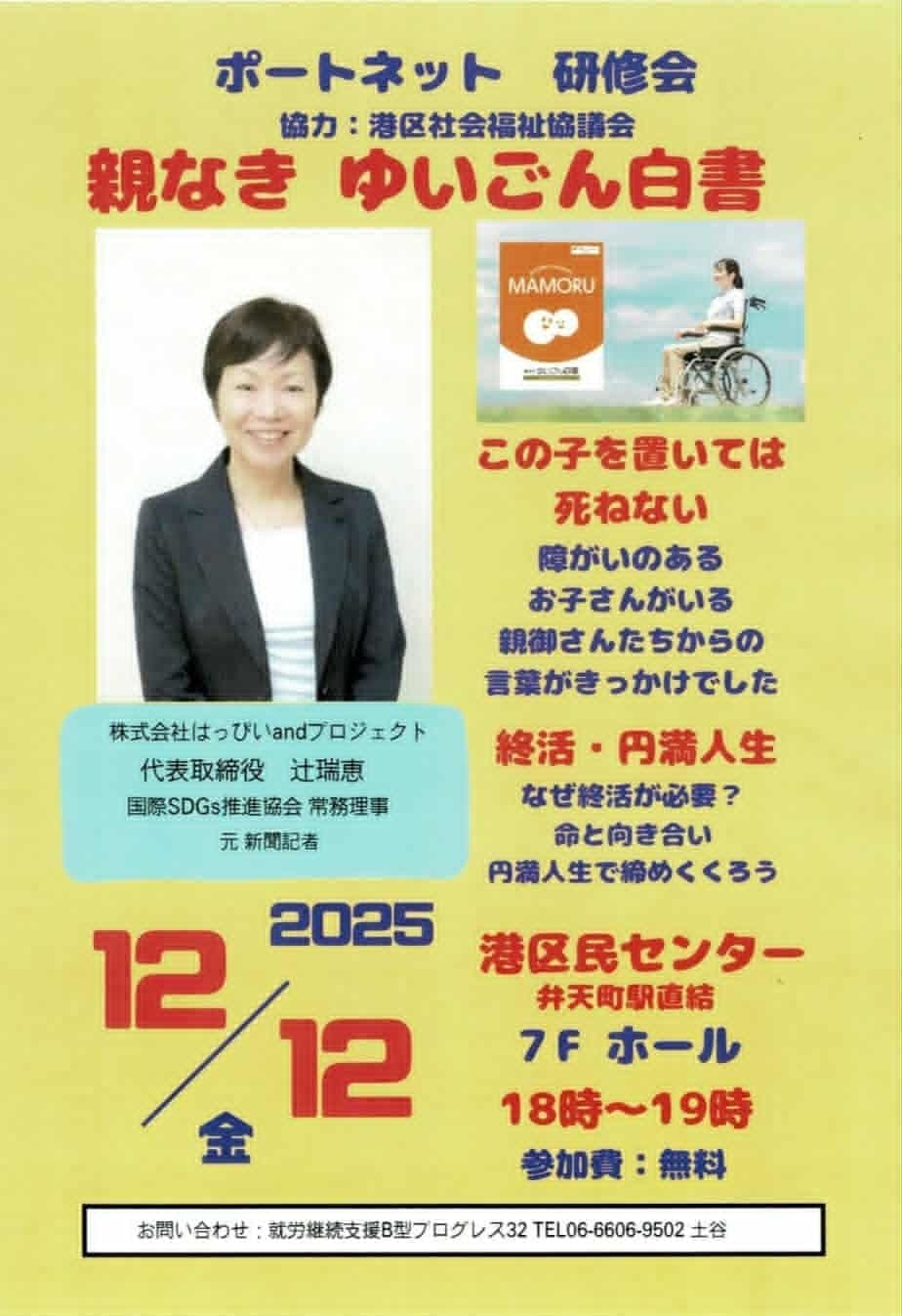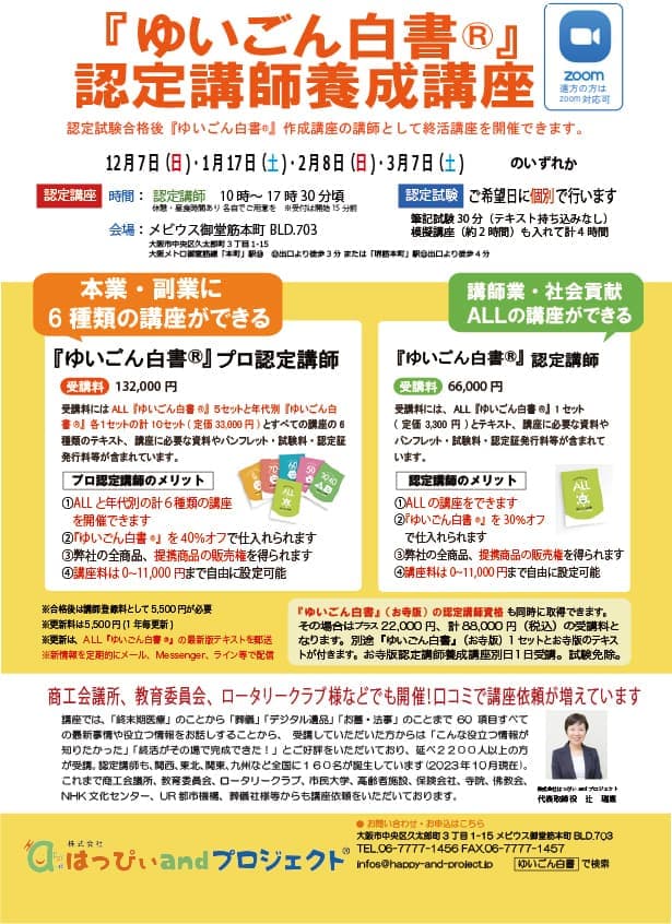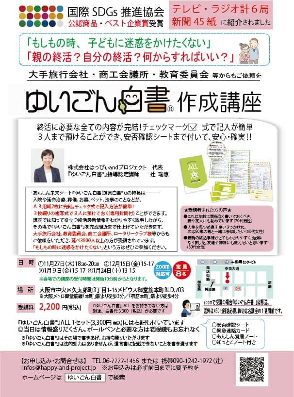 講座のご案内(本部) HOME | 講座のご案内(本部) お知らせFacebook「あんしん覚書ノート」のダウンロードはこちら (ご購入者専用)メディア掲載・出演/取材・出演依頼 お知らせ Facebook 「あんしん覚書ノート」のダウンロードはこちら (ご購入者専用) メディア掲載・出演/取材・出演依頼 日程はこちらをご覧ください https://calendar.google.com/calendar/u/0/r 講座のお申込み お電話またはメールでお申し込みください。TEL: 06-7777-1456(受付は平日10:00~17:00)infos@happy-and-project.jp 港区堺福祉協議会による「親なき『ゆいごん白書®』」講座を開催します。 クリックすると拡大してご覧いただけます ▶11月〜1月『ゆいごん白書®︎』作成講座の日程が決まりました! クリックすると拡大してご覧いただけます ▶12月〜3月『ゆいごん白書®︎』認定講師養成講座の日程が決まりました! クリックすると拡大してご覧いただけます ▶10月〜2026年1月のお寺版『ゆいごん白書®︎』認定講師養成講座の日程が決まりました!無料説明会は随時受付中です。(zoom可) クリックすると拡大してご覧いただけます ▶社長版『ゆいごん白書®︎』「経営健康診断」100 作成講座9月・11月の日程が決まりました! クリックすると拡大してご覧いただけます ▶社長版『ゆいごん白書®︎』認定講師養成講座2025年の日程が決まりました! クリックすると拡大してご覧いただけます