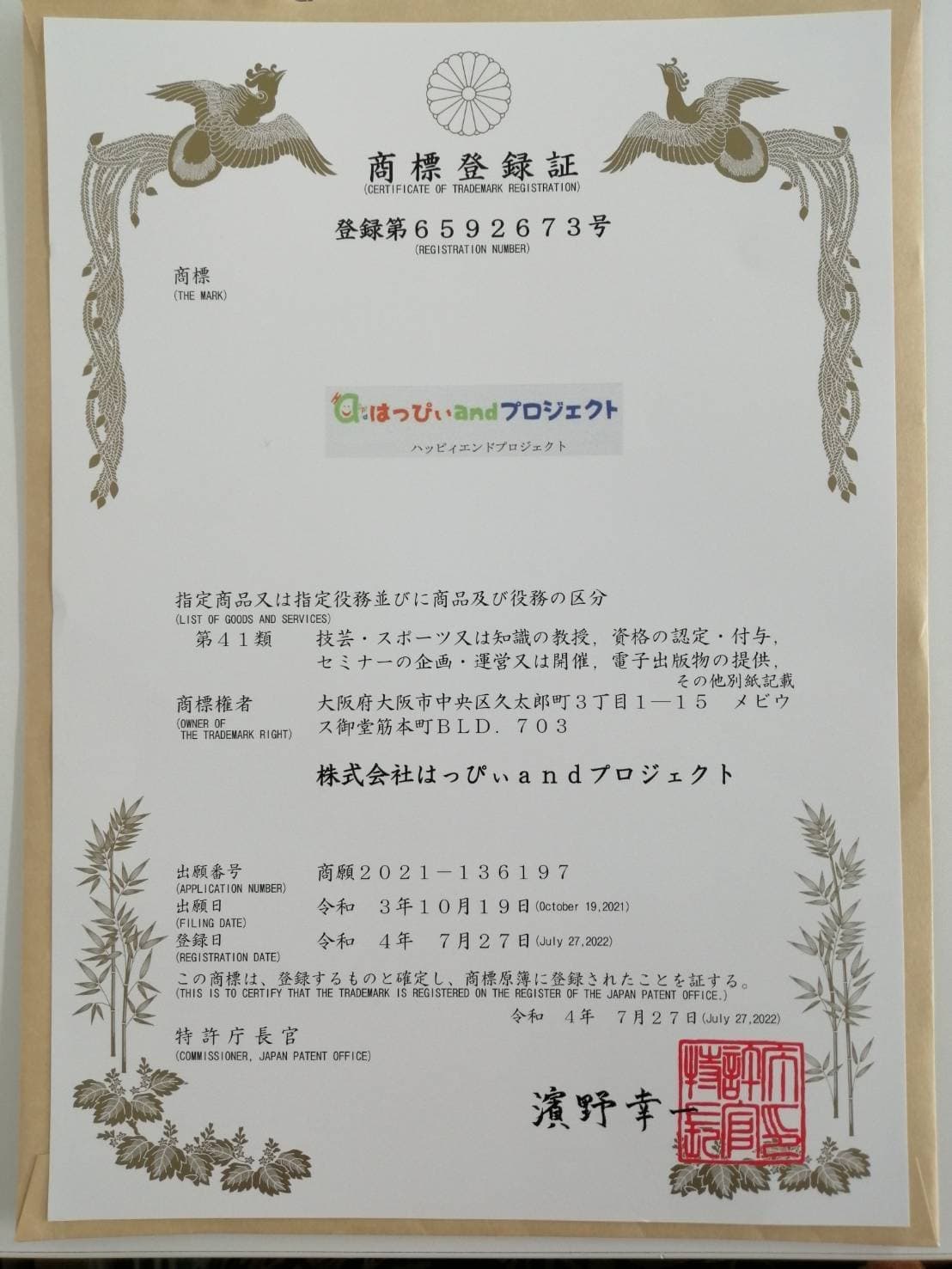 「はっぴぃand プロジェクト」の商標登録証が届きました。