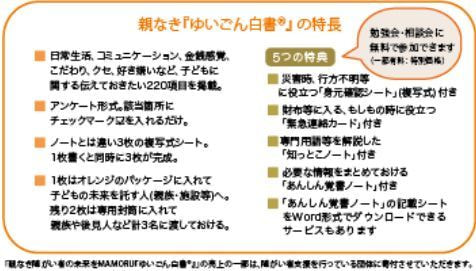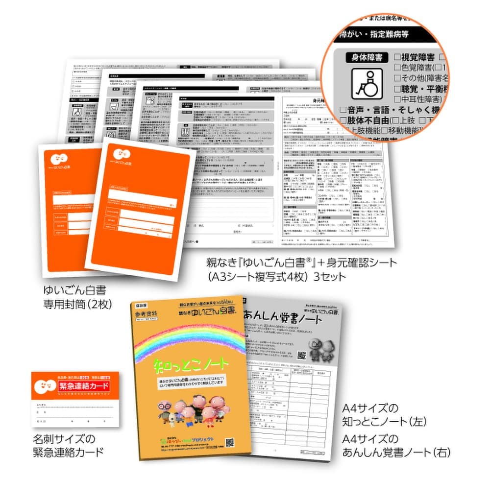 その言葉がずっと心に残り、「このままでは死ぬない」と悩む親御さんたちのお役に立てることはないだろうか。障がいのお子さんが親がいなくなったあと、少しでも安心して心穏やかに生きていけるためのツールを作れないだろうか・・・と考え、構想3年、制作期間1年半の歳月をかけて誕生したのが、「何を伝えて、何を準備しておけばよいのか」がひと目でわかる、この「親なき『ゆいごん白書®』」です。