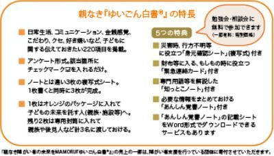 その言葉がずっと心に残り、「このままでは死ねない」と悩む親御さんたちのお役に立てることはないだろうか。障がいのお子さんが親がいなくなったあと、少しでも安心して心穏やかに生きていけるためのツールを作れないだろうか・・・と考え、構想 3年、制作期間 1年半の歳月をかけて誕生したのが、「何を伝えて、何を準備しておけばよいのか」がひと目でわかる、この「親なき『ゆいごん白書 ®』」です。