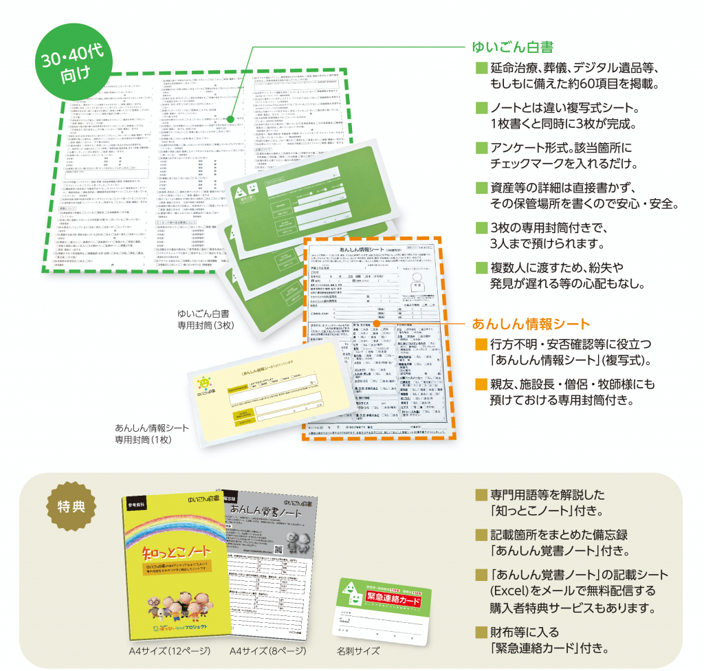 さらに『ゆいごん白書®』とは別に、安否確認に役立つ「あんしん情報シート」、財布などに入る「緊急連絡カード」や備忘録が1冊になった「あんしん覚書ノート」なども付いています。