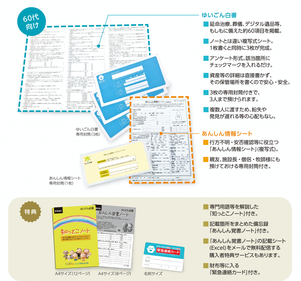 「60代のための『ゆいごん白書®』」なら、突然倒れた際の対応や財産管理、パソコン・スマホなどのデジタル遺品についての希望など、チェックしながら簡単に書きのこすことができます。さらに『ゆいごん白書®』とは別に、安否確認に役立つ「あんしん情報シート」、財布などに入る「緊急連絡カード」や備忘録が1冊になった「あんしん覚書ノート」なども付いています。