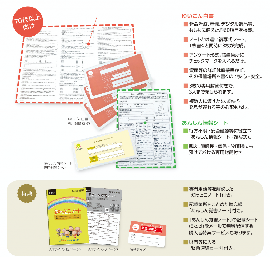 「70代からの『ゆいごん白書®』」なら、闘病生活や認知症への対応、相談している専門家の有無、遺品の処分方法についての希望など、チェックしながら簡単に書きのこすことができます。さらに『ゆいごん白書®』とは別に、財布などに入る「緊急連絡カード」や、これからやってみたい夢や目標を書き込める「はっぴぃライフシート」も付いています。