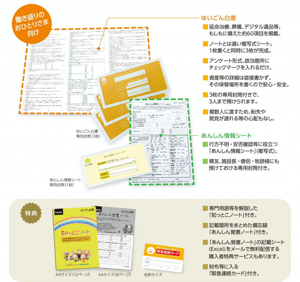「働き盛りのおひとりさまが選ぶ『ゆいごん白書®』」なら、会社への連絡や入院中の支払い、親の面倒を誰にお願いしたいのか、パソコンやスマホなどのデジタル遺品についての希望なども、チェックしながら簡単に書きのこすことができ、安否確認に役立つ「あんしん情報シート」、財布などに入る「緊急連絡カード」や備忘録が1冊になった「あんしん覚書ノート」なども付いています。