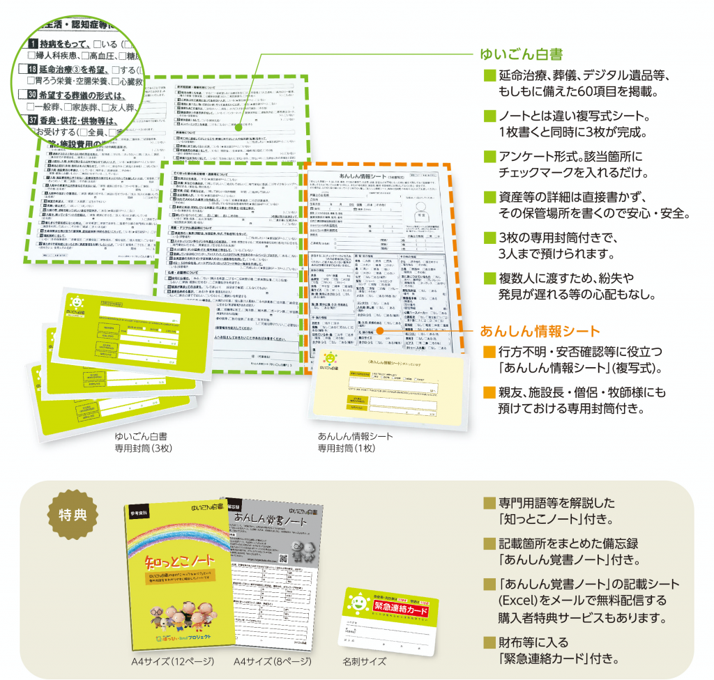さらに『ゆいごん白書®』とは別に、安否確認に役立つ「あんしん情報シート」、財布などに入る「緊急連絡カード」や備忘録が1冊になった「あんしん覚書ノート」なども付いています。