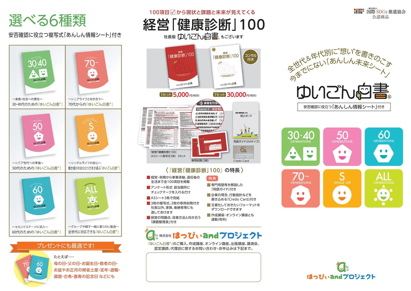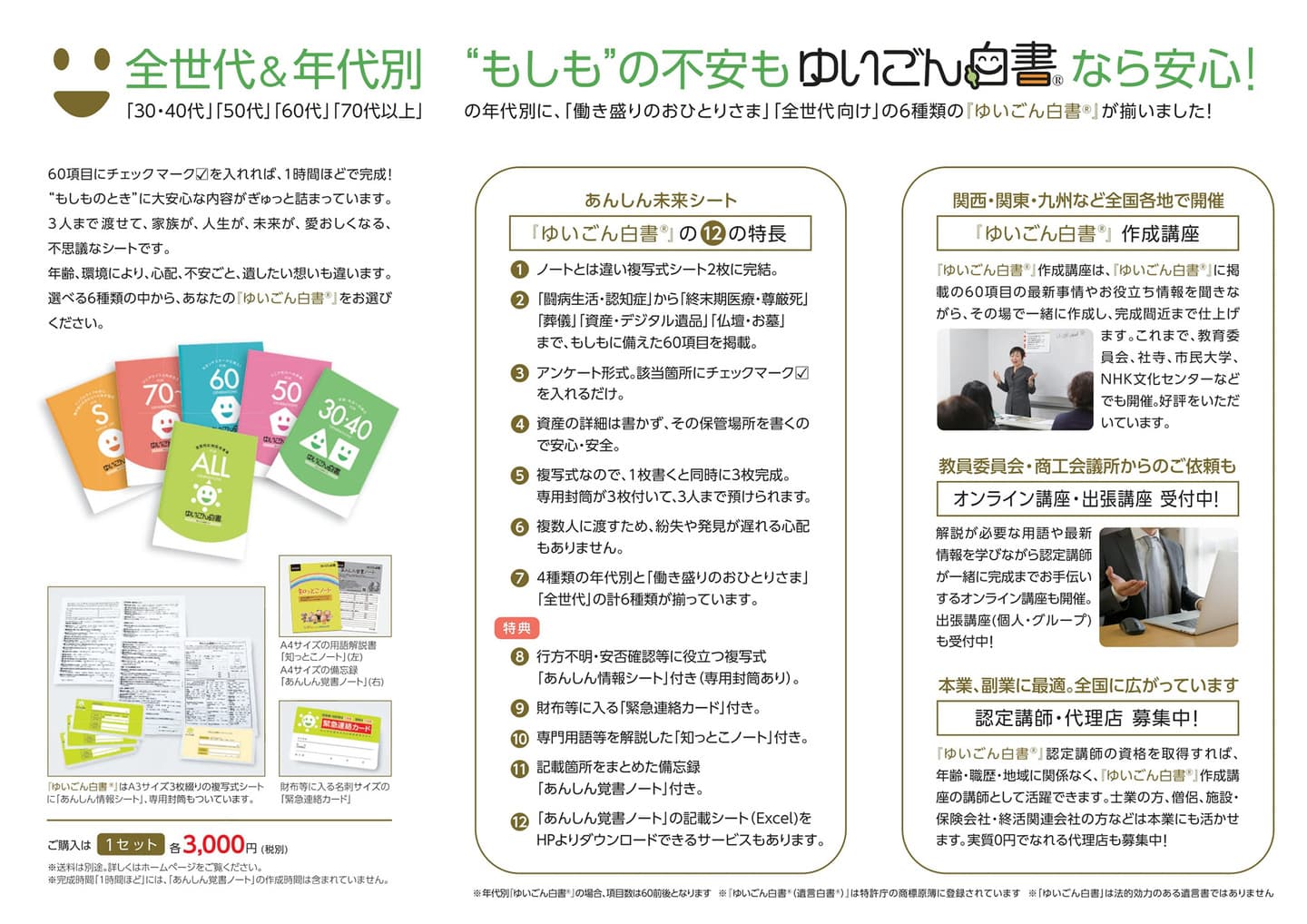全世代向け『ゆいごん白書』なら、20歳から100歳以上まで、年代に関係なくどなたにも共通する60項目の内容をチェックしながら簡単に書きのこすことができます。最新の終活情報を聞きながら、その場で一緒にチェックマークを入れて完成間近まで仕上げる『ゆいごん白書®』作成講座で使用するほか、親子、夫婦、きょうだい、親戚、職場の友人、婦人会、老人会、サークル仲間などと一緒に作成するときなどにもご活用いただけます。さらに『ゆいごん白書®』とは別に、安否確認に役立つ「あんしん情報シート」、財布などに入る「緊急連絡カード」や備忘録が1冊になった「あんしん覚書ノート」なども付いています。これを書いておけば、“もしもの時”も安心。ご家族・会社にも迷惑をかけずにすみ、より豊かで充実した人生を謳歌することができるでしょう。