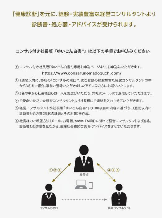 その中から社長自ら 1名を選んでいただき、選ばれたコンサルが診断書と処方箋を書き、アドバイスにあたります。