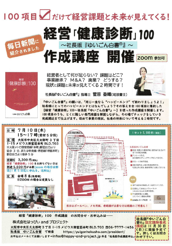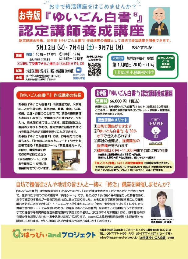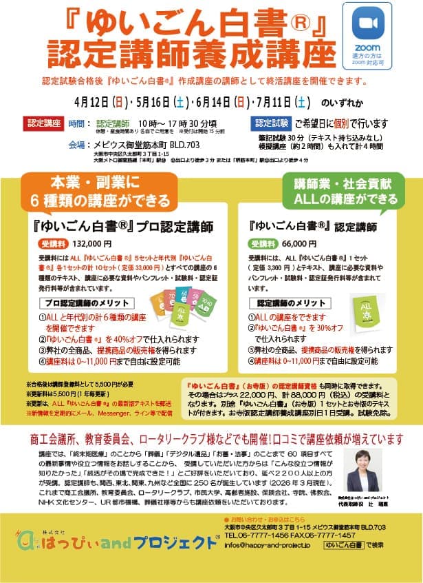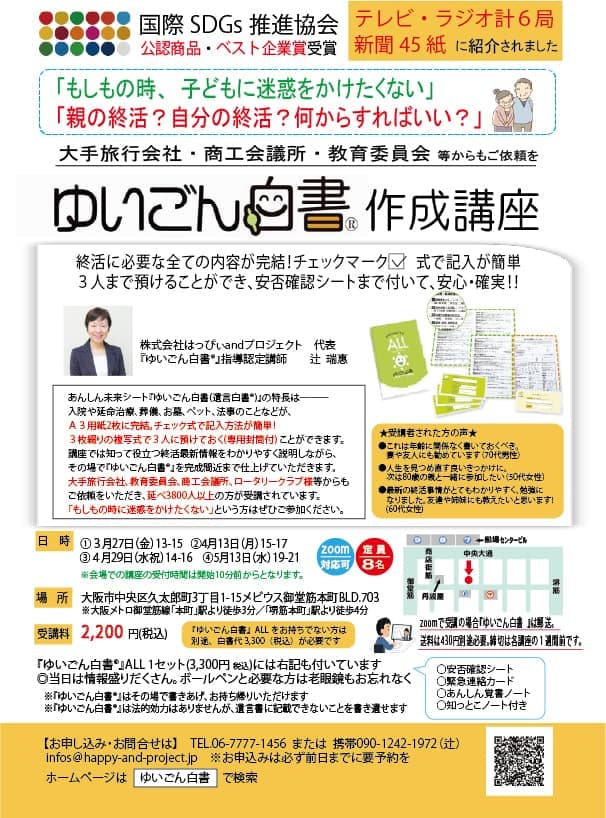講座のご案内(本部) HOME | 講座のご案内(本部) お知らせFacebook「あんしん覚書ノート」のダウンロードはこちら (ご購入者専用)メディア掲載・出演/取材・出演依頼 お知らせ Facebook 「あんしん覚書ノート」のダウンロードはこちら (ご購入者専用) メディア掲載・出演/取材・出演依頼 日程はこちらをご覧ください https://calendar.google.com/calendar/u/0/r 講座のお申込み お電話またはメールでお申し込みください。TEL: 06-7777-1456(受付は平日10:00~17:00)infos@happy-and-project.jp ▶『ゆいごん白書®︎』作成講座の日程 最新版です。 クリックすると拡大してご覧いただけます ▶『ゆいごん白書®︎』認定講師養成講座の日程 最新版です。 クリックすると拡大してご覧いただけます ▶お寺版『ゆいごん白書®︎』認定講師養成講座の日程 最新版です。無料説明会は随時受付中です。(zoom可) クリックすると拡大してご覧いただけます ▶社長版『ゆいごん白書®︎』「経営健康診断」100 作成講座 日程最新版です。 クリックすると拡大してご覧いただけます ▶社長版『ゆいごん白書®︎』認定講師養成講座2025年の日程が決まりました! クリックすると拡大してご覧いただけます