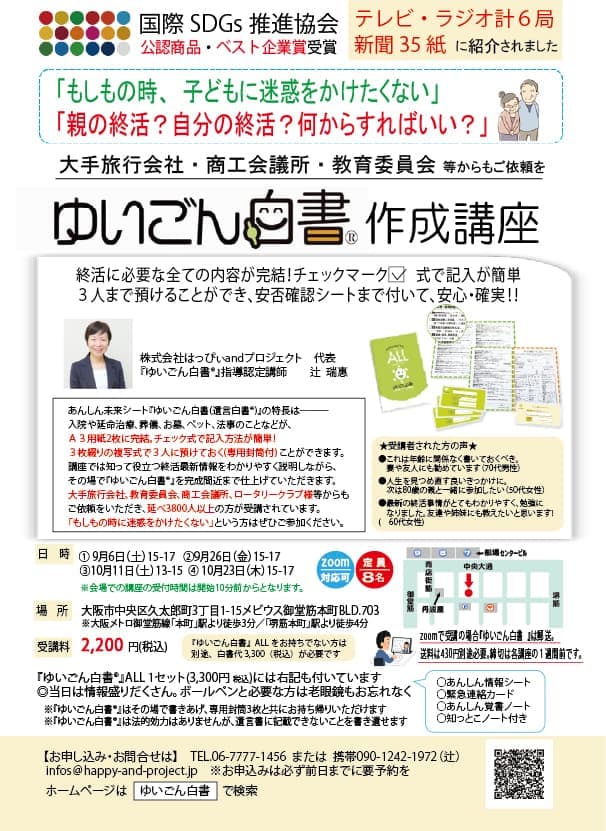 講座のご案内(本部) HOME | 講座のご案内(本部) お知らせFacebook「あんしん覚書ノート」のダウンロードはこちら (ご購入者専用)メディア掲載・出演/取材・出演依頼 お知らせ Facebook 「あんしん覚書ノート」のダウンロードはこちら (ご購入者専用) メディア掲載・出演/取材・出演依頼 日程はこちらをご覧ください https://calendar.google.com/calendar/u/0/r 講座のお申込み お電話またはメールでお申し込みください。TEL: 06-7777-1456(受付は平日10:00~17:00)infos@happy-and-project.jp 一般社団法人 障害のある子のライフプランサポート協会のオンライン講座が開催されます チケットはpitaxよりご購入ください↓ https://peatix.com/event/4558227/view クリックすると拡大してご覧いただけます 親と自分のための終活&資産管理セミナーを開催します。お申し込みはお電話側はチラシ掲載のQRコードよりどうぞ。 クリックすると拡大してご覧いただけます 9月〜10月までの『ゆいごん白書®︎』講座の日程が決まりました! クリックすると拡大してご覧いただけます ▶8月〜12月『ゆいごん白書®︎』認定講師養成講座の日程が決まりました! クリックすると拡大してご覧いただけます ▶10月〜2026年1月のお寺版『ゆいごん白書®︎』認定講師養成講座の日程が決まりました!無料説明会は随時受付中です。(zoom可) クリックすると拡大してご覧いただけます ▶社長版『ゆいごん白書®︎』「経営健康診断」100 作成講座9月・11月の日程が決まりました! クリックすると拡大してご覧いただけます ▶社長版『ゆいごん白書®︎』認定講師養成講座2025年の日程が決まりました! クリックすると拡大してご覧いただけます